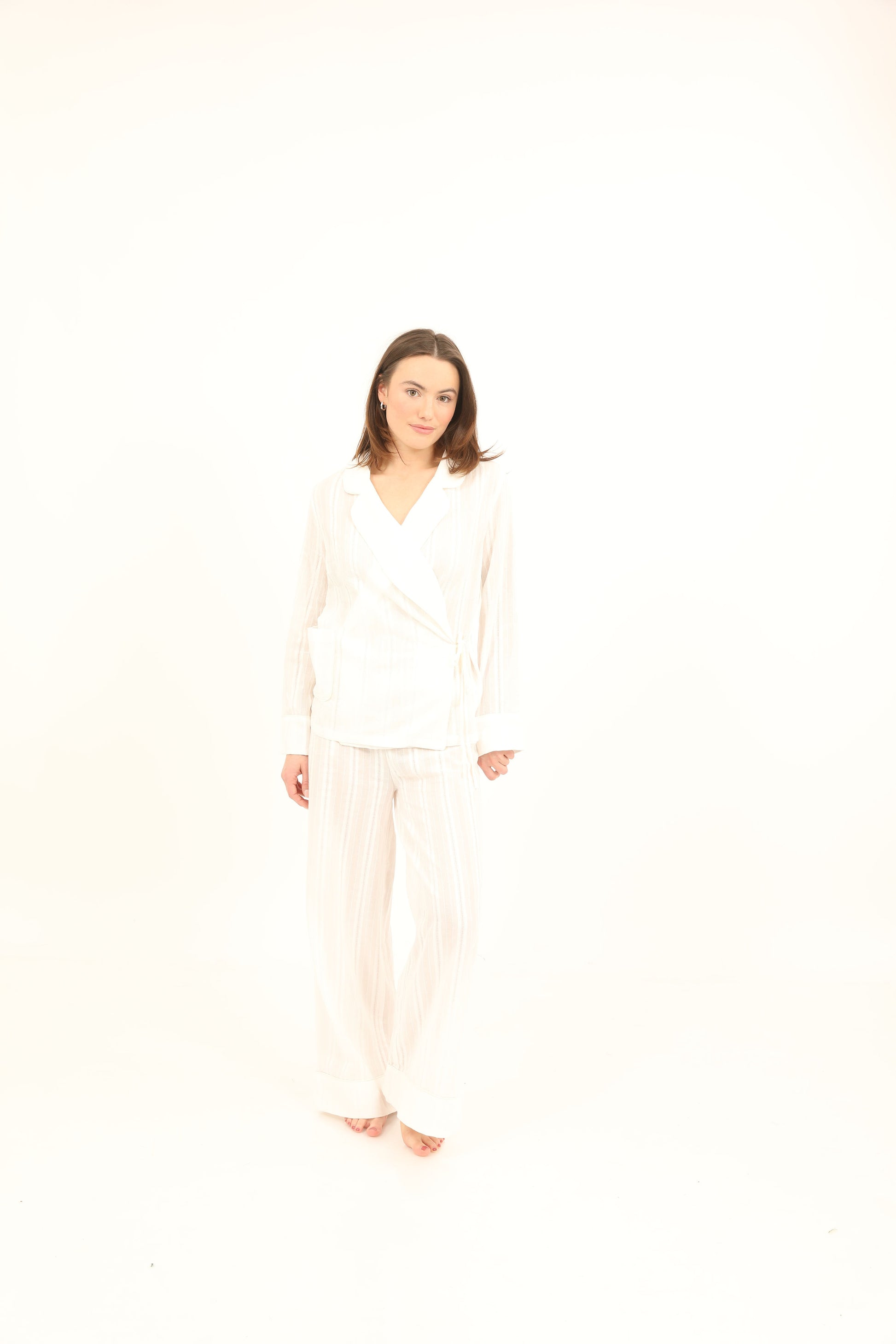 The Parlour Robe features wide sleeves, delicate piping, and a tie that gathers at the waist. Wear it layered over Margaux's Bloomers or the Parlour Pants.